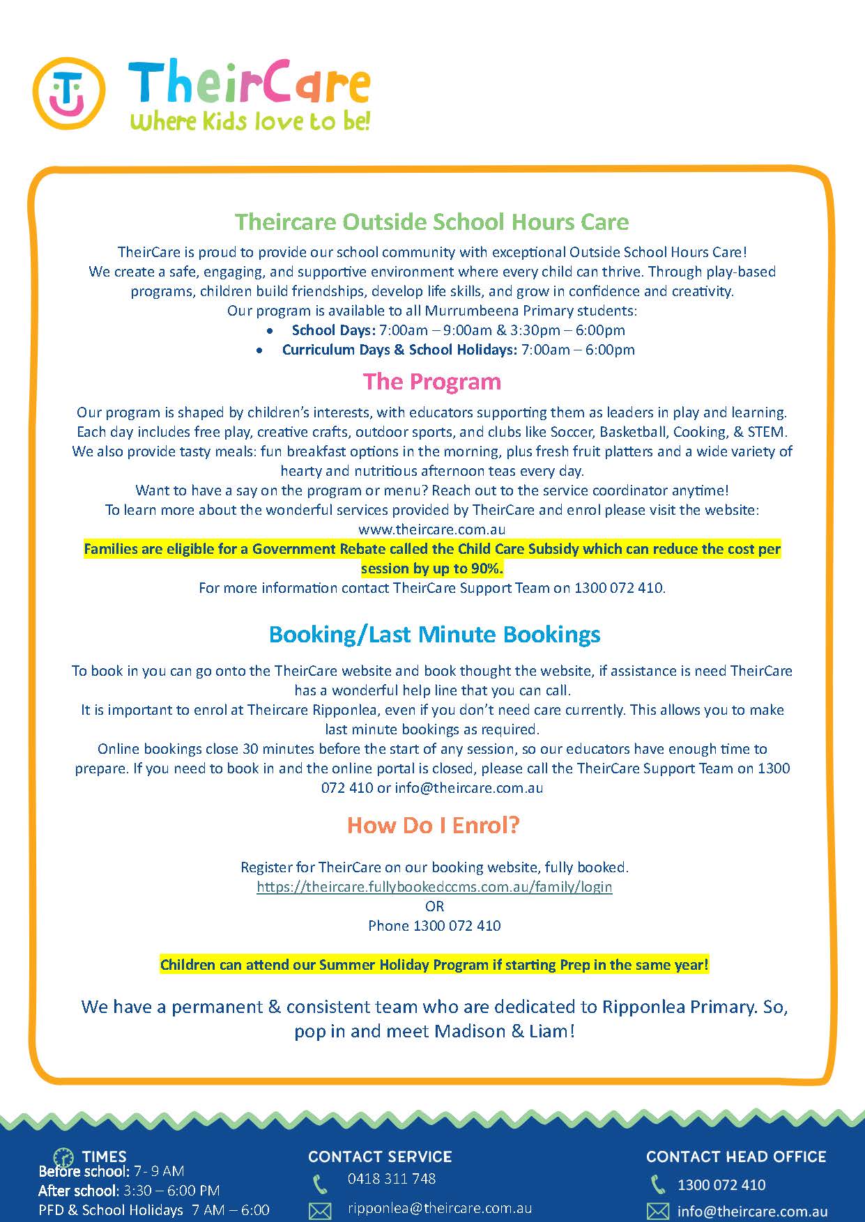 We encourage all families to register their child/ren with TheirCare for the times you may be unavoidably detained at pick-up time.